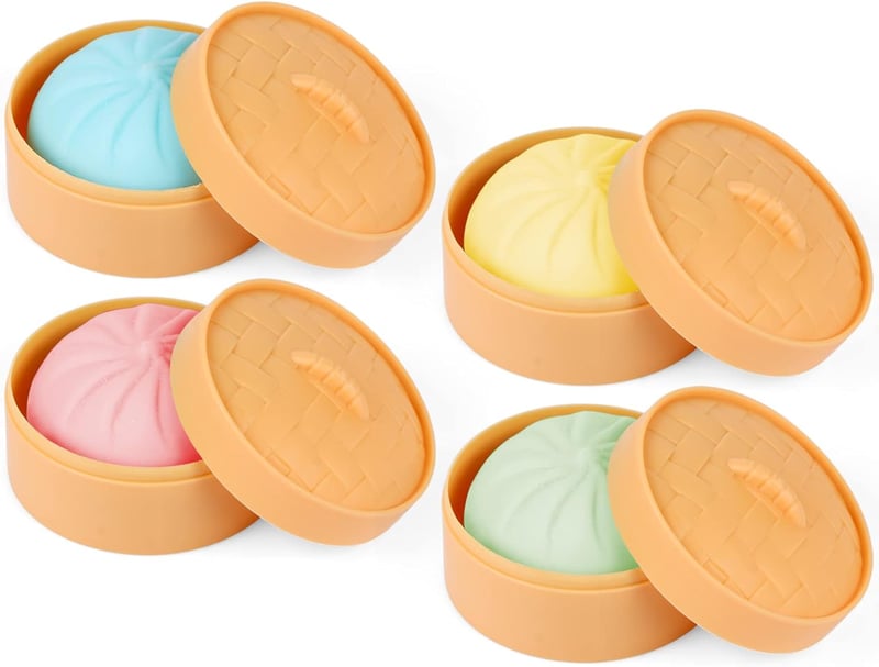 4 PCS Colorful Dumpling Stress Balls Fidget Sensory Toy,Squeeze Dough Ball Stress Relief Hand Toy,Bun with Food Steamer Stretchy Desk Toys